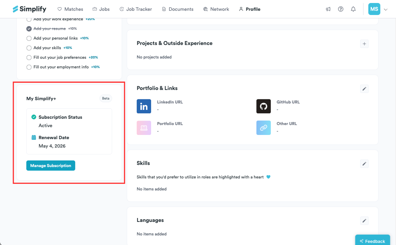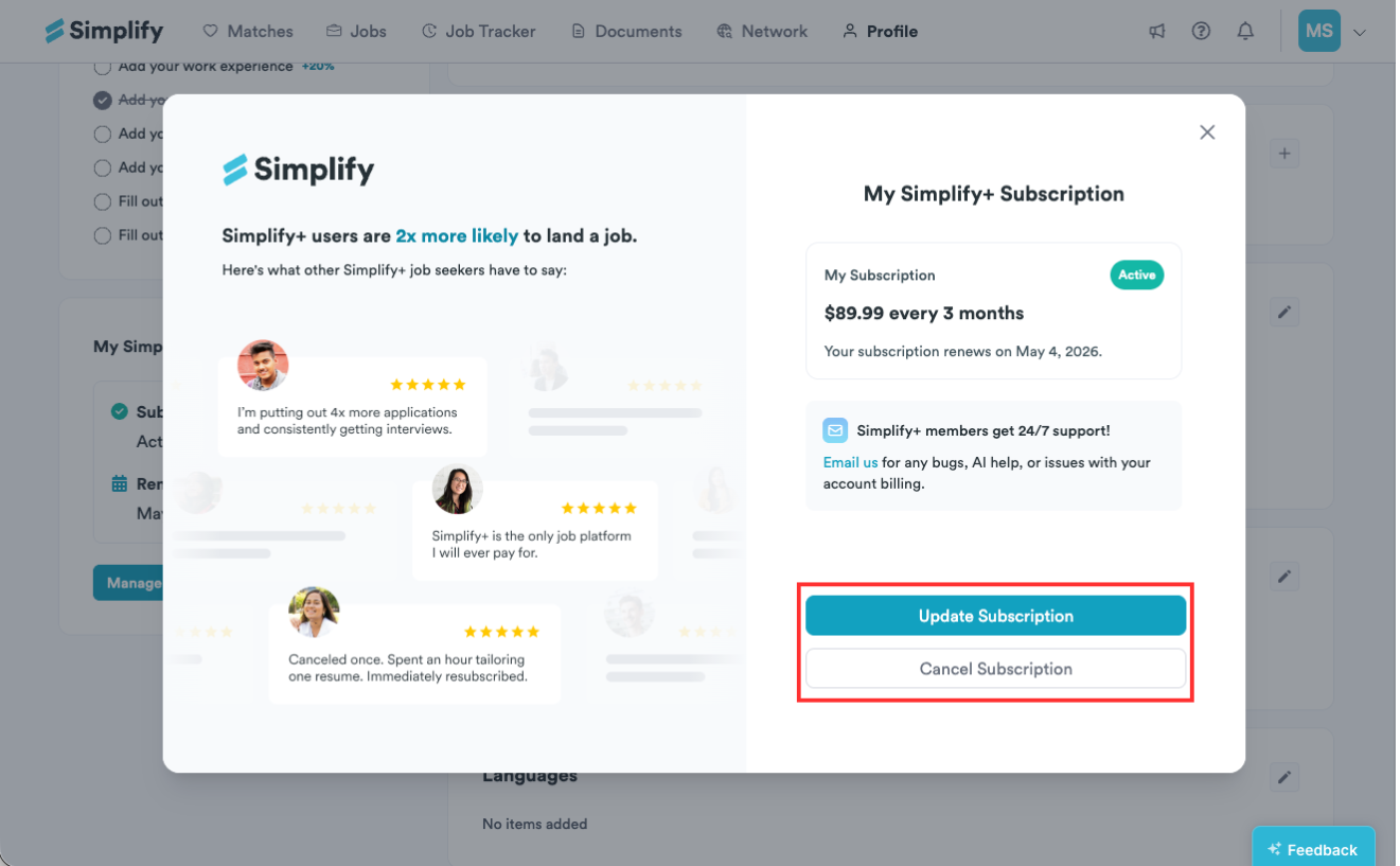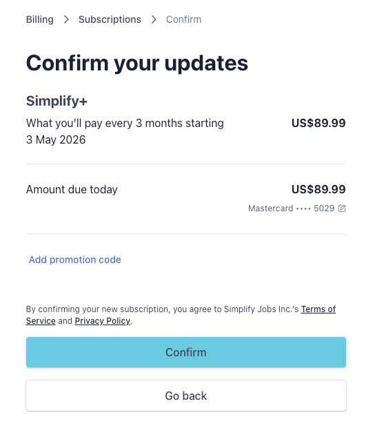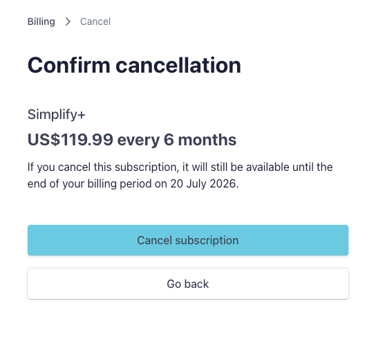 Go to your profile and scroll down until you see the My Simplify+ card on the bottom left, then click Manage Subscription.