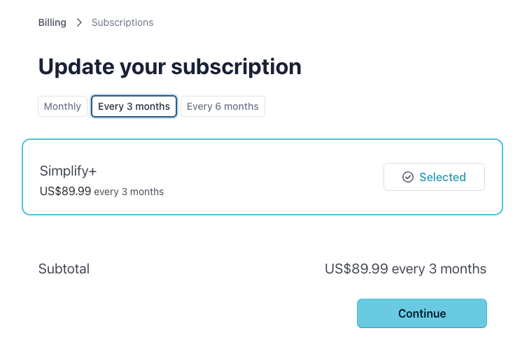 To update your subscription, click Update Subscription to change your plan to weekly, monthly, or quarterly. Click Continue, then review and confirm your purchase on the next page.